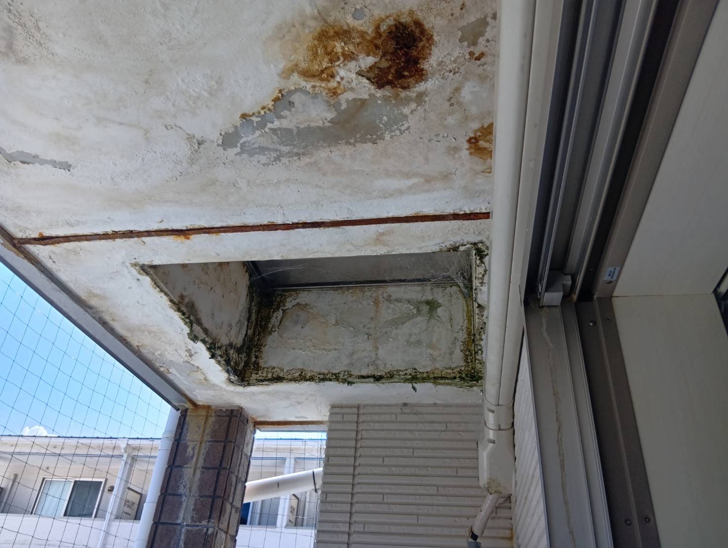 上階のシーリングが劣化したことにより、避難ハッチから漏水してケイカル板の天井が劣化しておりました。